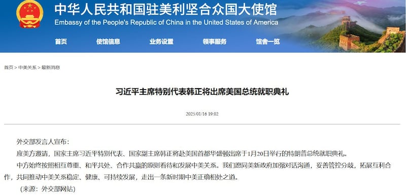 另外,中方宣布,國家副主席韓正將作為習近平的「特別代表」,應邀出席下周一舉行的特朗普就職典禮。