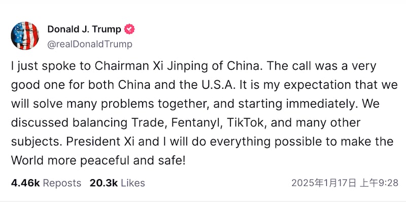 特朗普說:「我期待我們能立即開始共同解決許多問題。我們討論了貿易平衡、芬太尼、TikTok以及許多其他議題。習主席和我將竭盡全力使世界變得更加和平與安全!」