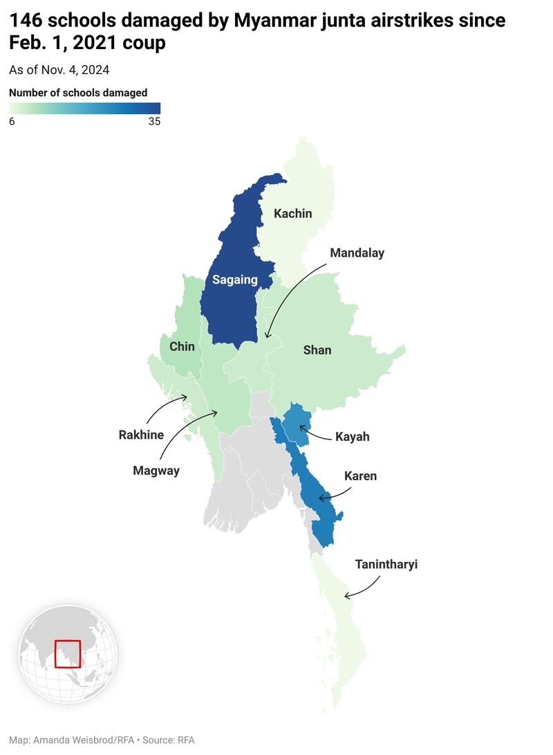 The air strikes destroyed 146 educational facilities, including universities, public schools and monastic schools, in Sagaing, Magway and Mandalay regions, and in Kayin, Rakhine, Chin, Kachin and Kayah states, which have seen fighting by resistance forces that oppose junta rule.